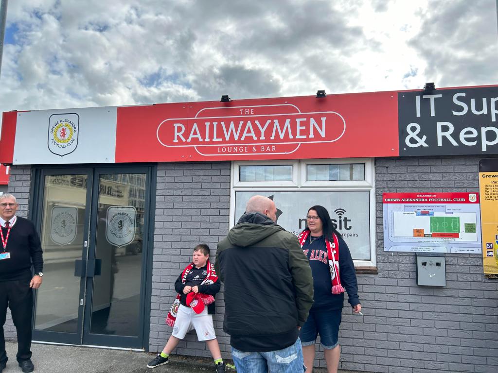 2 and a half hours, and 19 stops, later we arrived in Crewe. We met my Grandad off the train and headed for some lunch at the nearby Duke of Gloucester pub. From there we headed to the ground via the newly refurbished Railwaymen bar and lounge. More on that later on.