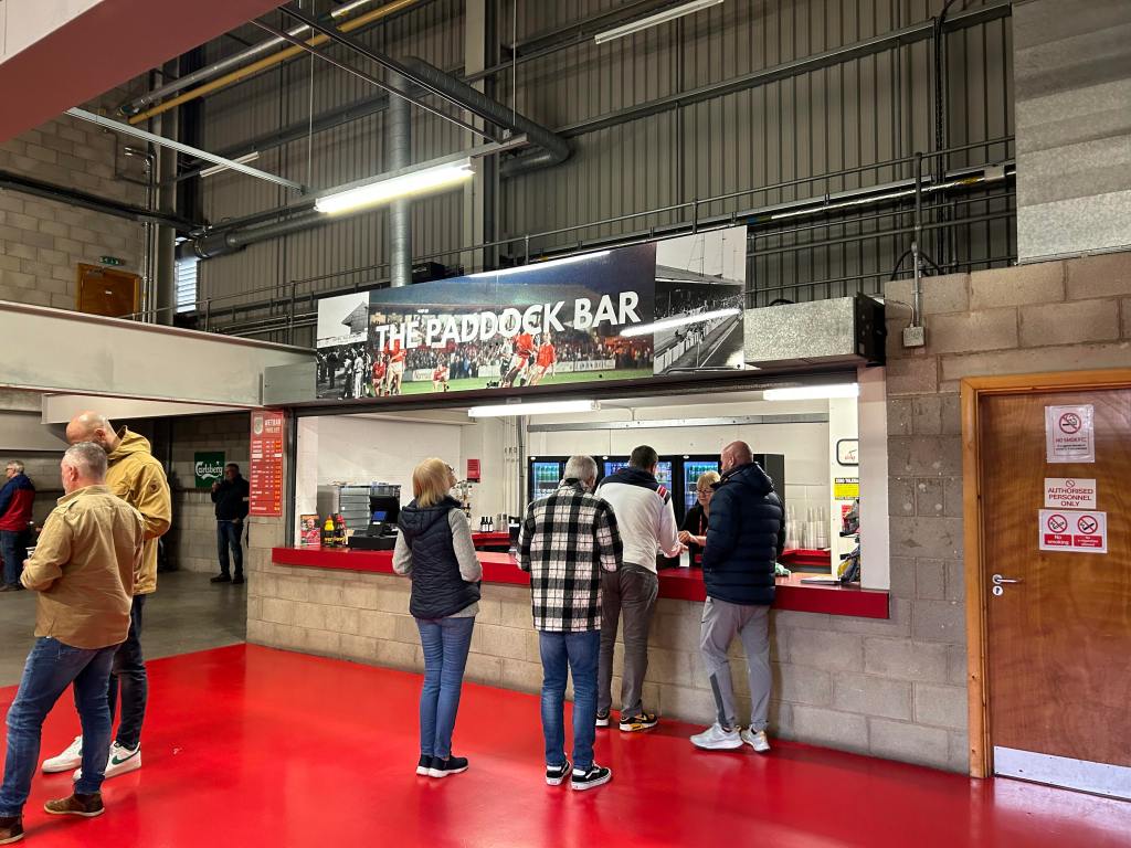 The main stand bar and food kiosk were pretty standard for a league ground. There’s plenty of space under the stand to have a drink or eat your food and the red paint on the floor is a new addition since our last visit and a nice touch.
