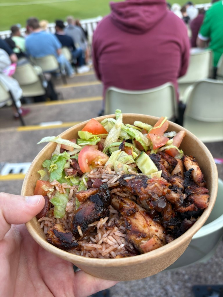 We waited until just before the start of the 2nd match to grab ourselves some food, and with a great variety of food trucks on offer we decided on trying 2! I went for jerk chicken and rice whilst Emma chose a pepperoni pizza