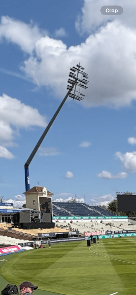 I must also mention the impressive floodlights which when lit up show a large ‘e’ for Edgbaston. These are a very strange design as they lean over the stands above the pitch