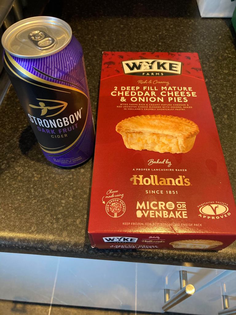The bar included a vast array of drinks including the always important Strongbow dark fruits. The usual bonus half point will be given for this! We decided to try and recreate a real football league matchday experience with a Hollands cheese and onion pie, as sold at Gresty Road. The pie was surprisingly nice and I would recommend them. Sadly though the Chef (me!) over cooked them slightly and they were slightly brown round the edges.
