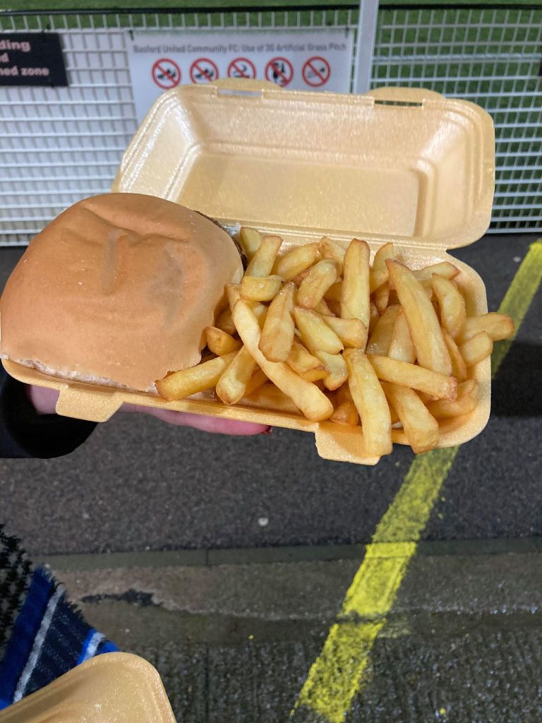As stated earlier, sadly the clubhouse wasn’t open so we had to settle for a can of pepsi when it came to drinks. Obviously this isn’t the fault of the club at the current time so we can’t be too harsh when it comes to that. Luckily for us though, the kitchen was open and we made the most of this ordering a cheese burger and chips each. The chips were nice and crispy and the burger your typical football burger. Nothing to shout about but it did the job! Sadly no onions which was a shame but can’t complain too much at £4 each.