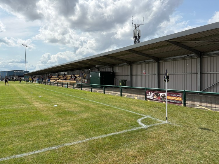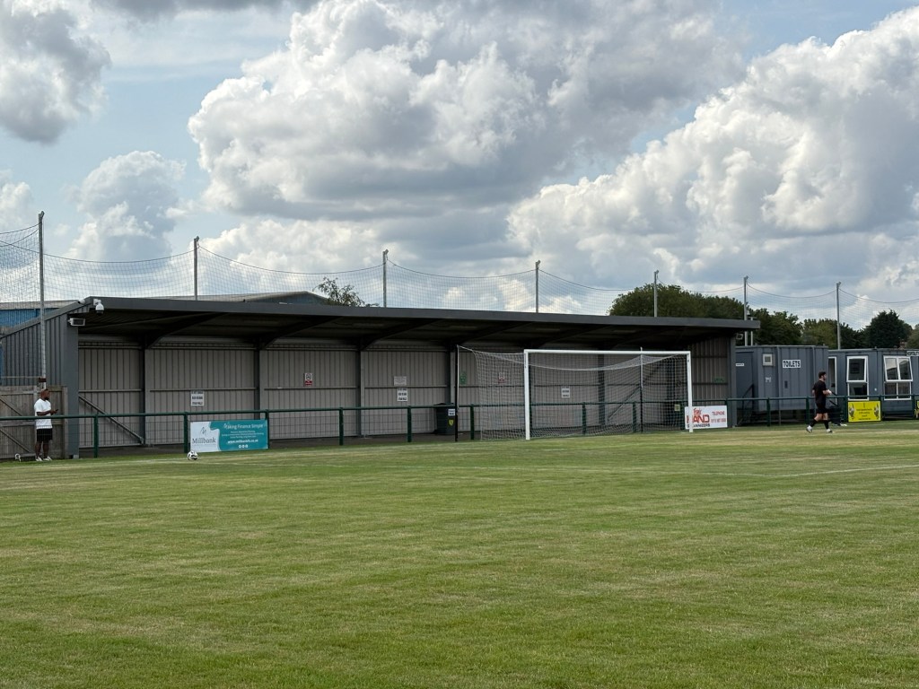 Behind one of the goals is another large covered standing area as well as temporary containers which house the hospitality lounge and club shop. The other 2 sides of the ground are open standing. The ground is functional and more than adequate for the level the club currently play at.