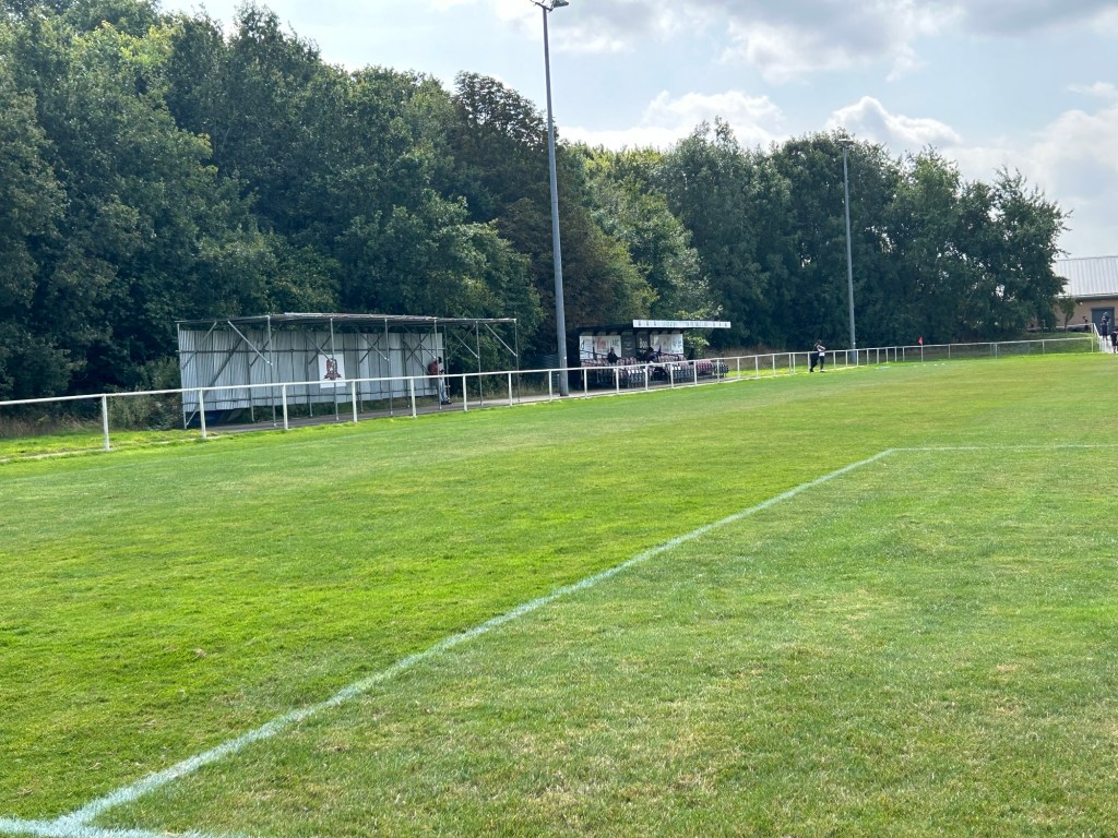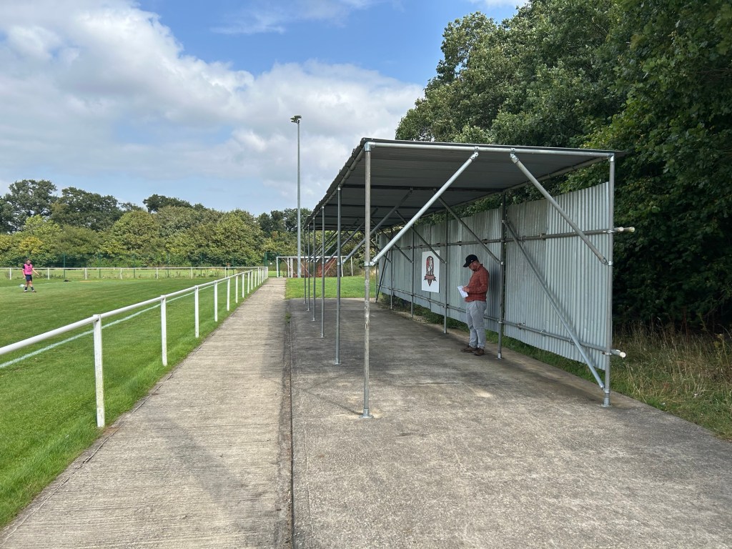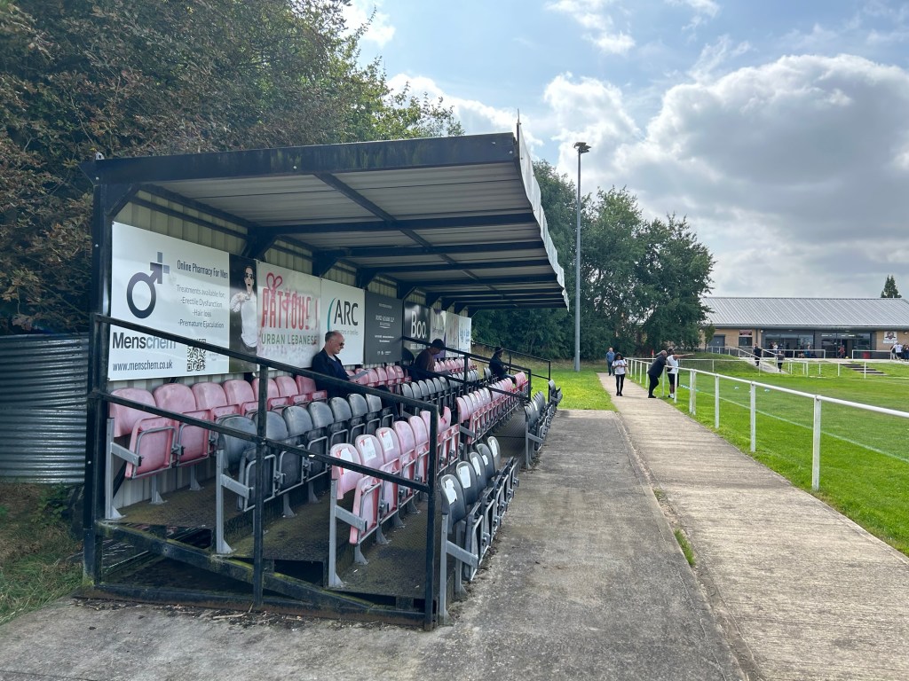 The ground contains hard standing around all 4 sides. Along one side of the pitch are the 2 covered stands. The seated stand is a pre built ‘arena’ stand which contains all of the grounds seats. Next to this is a covered standing area which appears to be made of scaffolding. Not the prettiest stand we have ever seen but it does the job!