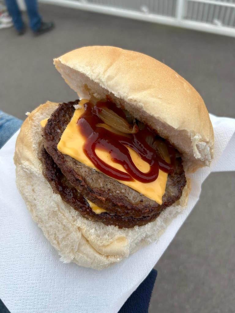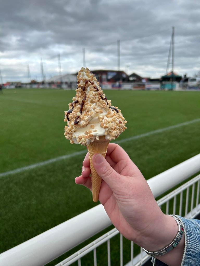 There is no kitchen within the ground so the food available at todays game came from a variety of food vans parked behind the goal. There was local pub ‘The Honeycomb’ there serving fresh burgers and chips out of their van or if you wanted something else there was also fresh woodfired pizzas available. But something that really caught my eye and that I couldn’t say no to was an ice cream van and for a single cone with toppings only setting you back £2 you’d be silly not to indulge in a half-time ice cream. Max went for a half pounder cheeseburger with onions which he said was nice and pretty standard for a burger van but at £6 thought it was a little steep.