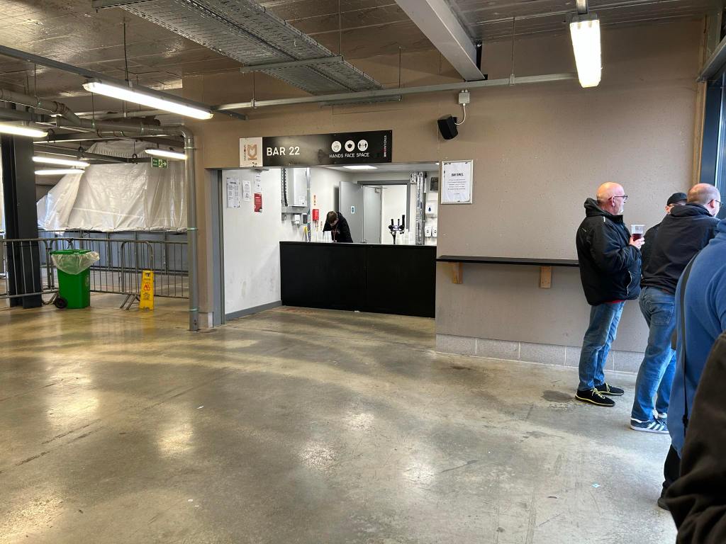 The away fans are housed in one corner of the upper tier of the stadium. The concourse in this area is a good size with 2 separate kiosks for fans to buy food and drink from. It was a slightly strange set up with fans ushered into a pen which was patrolled by stewards. The view towards the pitch was blocked by white tarpaulin which made the area seem unfinished.