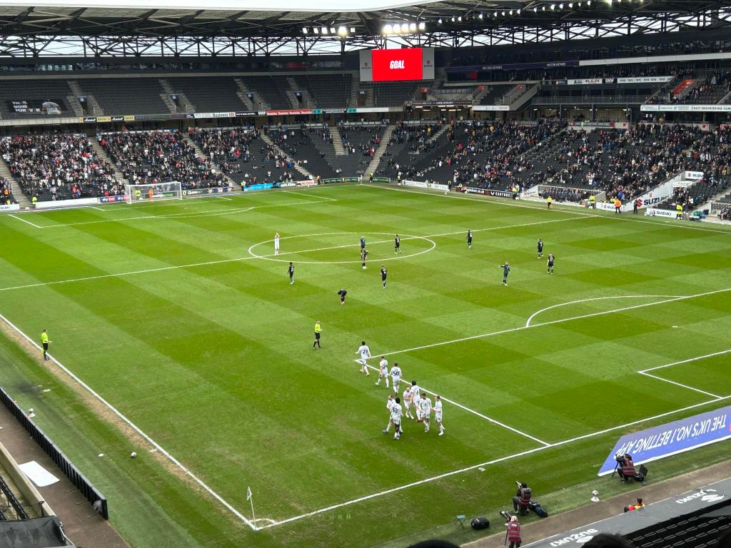 The lower tier and pitch are actually below ground level with entrance through the turnstiles getting you into large open concourse in between the 2 levels of seating. The ground looks really smart from the inside and out and the only negative is the fact that it is far too big for a club the size of MK Dons meaning the crowd was spread thinly between a seas of empty black seats. This meant that at times the game felt more like a pre season friendly rather than a promotion 6 pointer with the atmosphere as flat as a pancake!