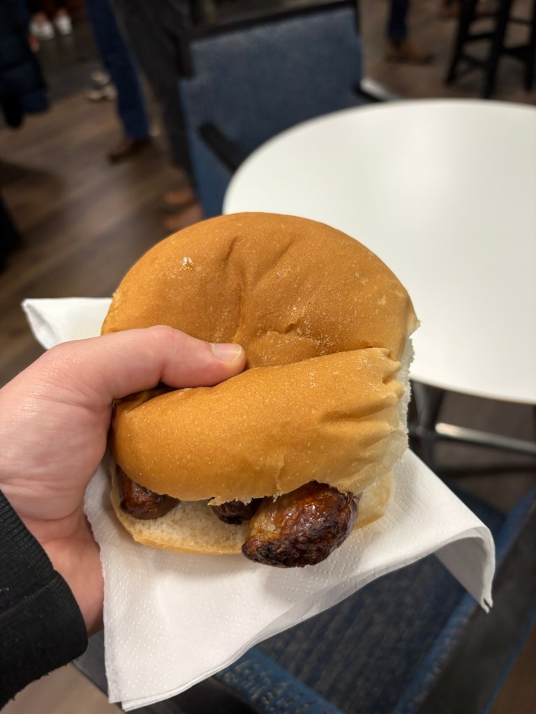 Unfortunately I wasn’t massively hungry so went for one of the other 2 options which was a choice of bacon or sausage cob. I went for a sausage one and was handed a large roll filled with 3 butchers quality sausages. I really enjoyed it although (unless I missed it) I didn’t see the option to add sauce which would have finished it off nicely.