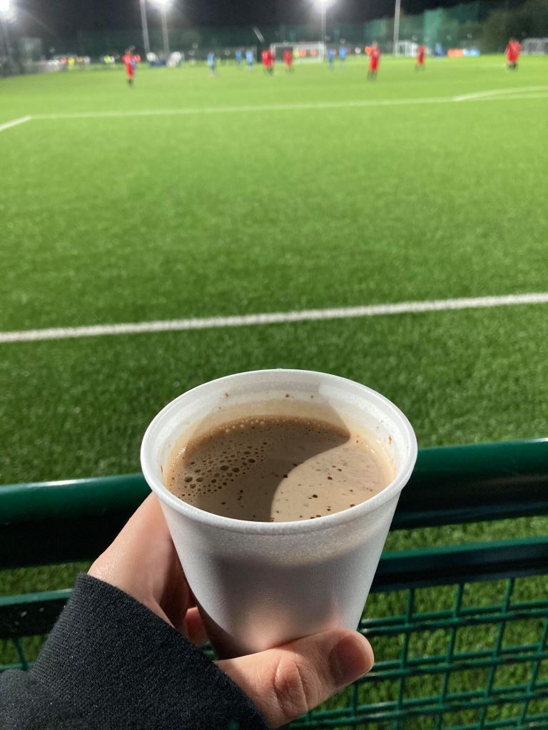 The food, as stated earlier was available from a burger van. As far as burger vans go the food was of very good standard with plenty of variety on offer. I had a cheese burger and Emma had Chips. The burger was very good and the chips were crispy and tasty. We both had a hot chocolate during the second half and connoisseur of the chocolatey delight Emma was very impressed. We have rated them down slightly as the food was from a burger van and therefore not from the club itself. There was also no alcohol available as there’s no bar on site