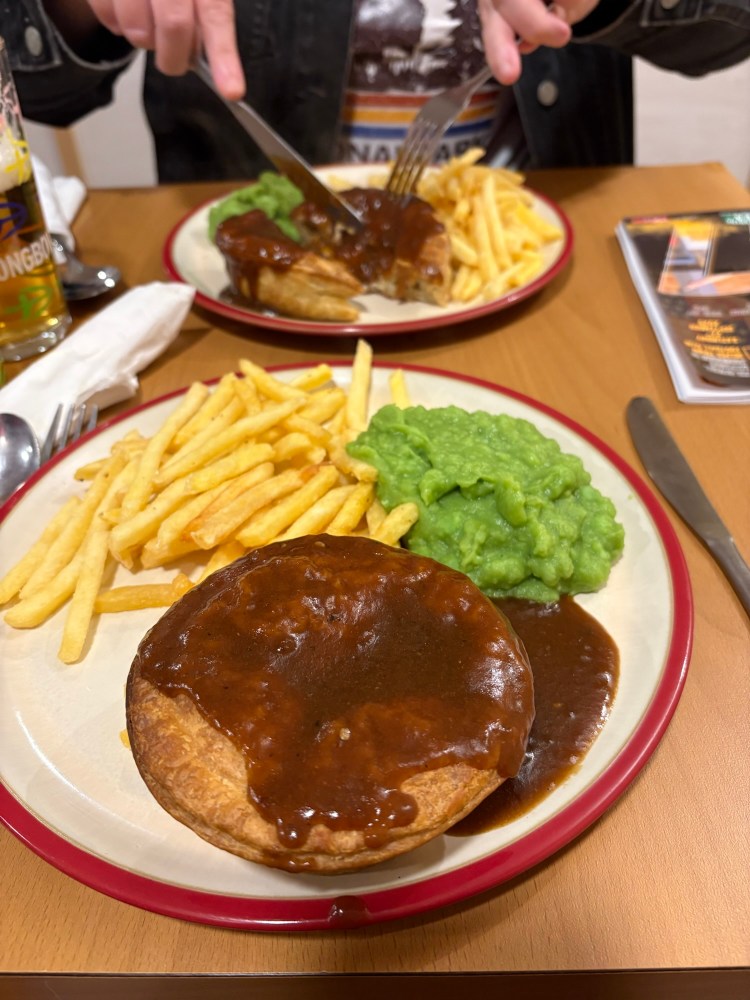 Shortly after we were asked what we would like for our main course, the choices being a selection of pies. I went for steak while Emma opted for chicken and mushroom. These were both served with skinny fries and mushy peas.