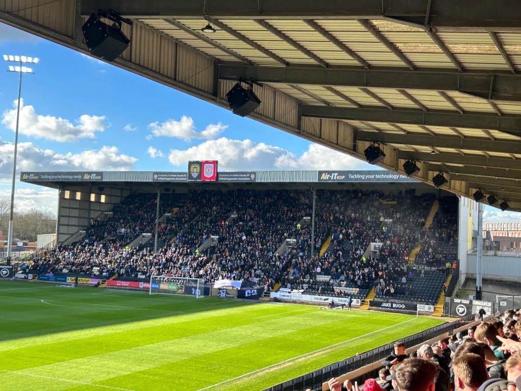 Meadow Lane is one of lower league footballs most iconic grounds. Notts County have played their since it was built in 1910 and it has an all seated capacity of just under 20,000. The main stand opposite us in the away end holds over 6,700 fans including the hospitality area and is named after the clubs former chairman Derek Pavis. To the left of the away fans is the Haydn Green Family Stand.
