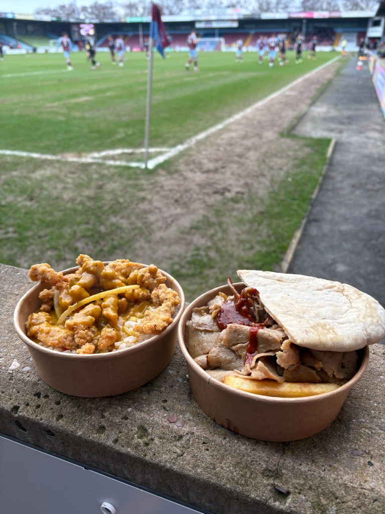 Max offered just before the half time whistle to go and grab food to beat the crowd, we both agreed to just get something to share as we were expecting the average burger or pukka pie that you get at most grounds. But on his arrival it is like the clouds parted and sun shone down on what he was carrying….doner kebab and chips plus salt and pepper chicken pieces on a bed of rice with quite possibly the best curry sauce I have eaten. We did also hear rumours that Apple Crumble was on but after only seeing this special after he had ordered we did miss out on tasting this.