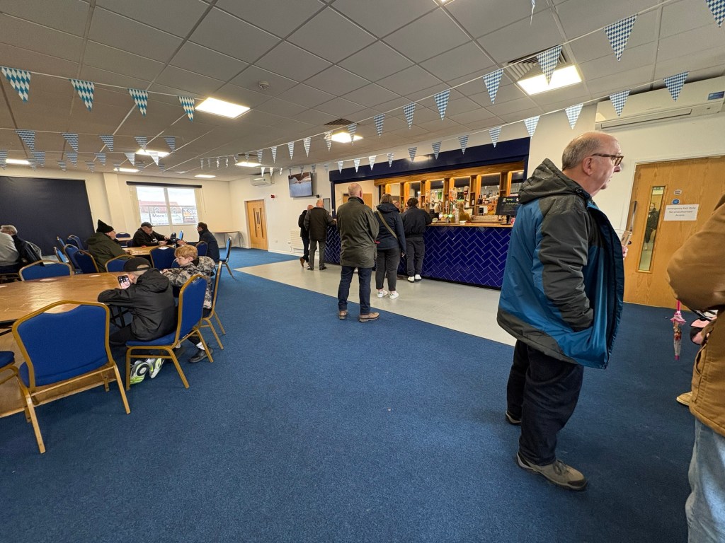 The clubhouse is located next to the main stand and consists of a large bar area with big round tables meaning there’s plenty of space to sit. The bar is itself is nicely finished with dark blue tiles although the rest of the room is starting to look a little tired and could maybe do with a bit of modernisation. This being said, we do like when clubs use their own colours in their clubhouses and this is very much the case here with blue carpet and chairs.