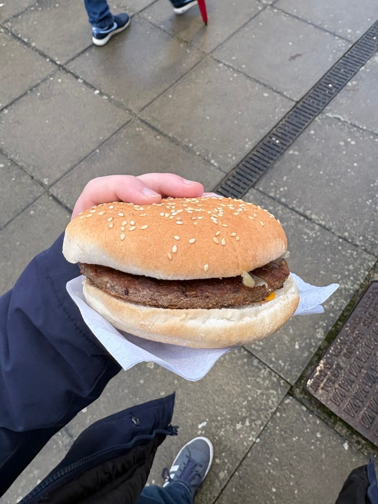 Having eaten before the game in the town centre, we weren’t particularly hungry so at half time I joined the queue and wasn’t sure what I wanted. There was a limited menu of burgers and chips with a variety of sauces and toppings available. I went for the standard cheeseburger. This came with onions which is always a welcome bonus but unfortunately the burger was just incredibly average. It wasn’t the warmest and reminded me of a microwave rustlers burger.